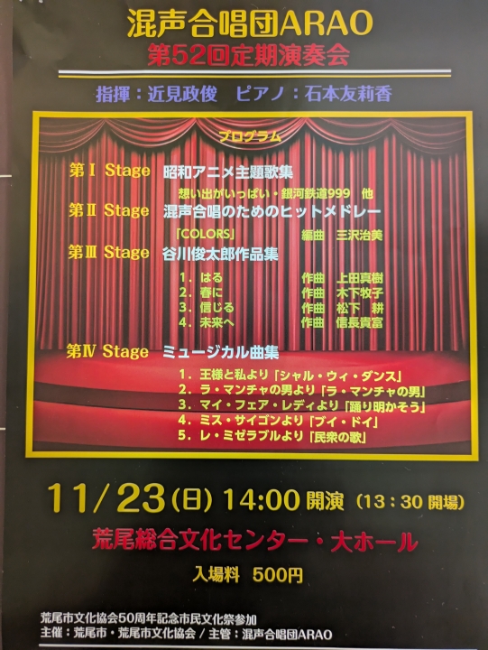 - 混声合唱団ARAO「第52回定期演奏会」開催 11月23日(日) 14時開演 【荒尾総合文化センター・大ホール】