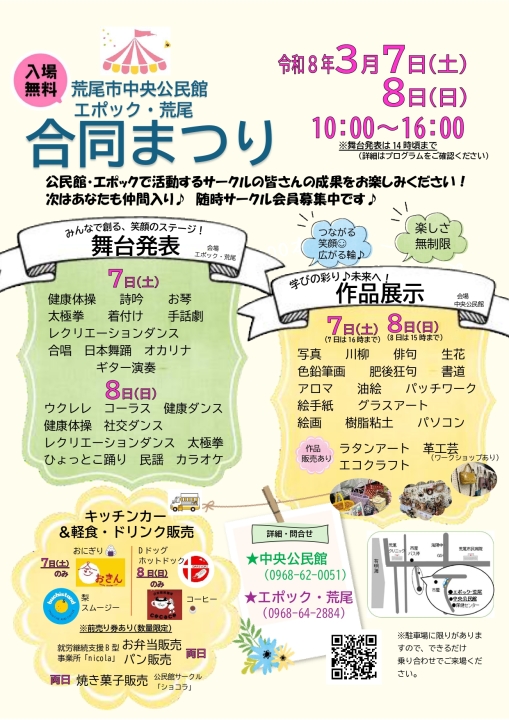 3月7日(土)・8日(日)2日間でエポック荒尾・荒尾市中央公民館の合同まつりを開催致します。