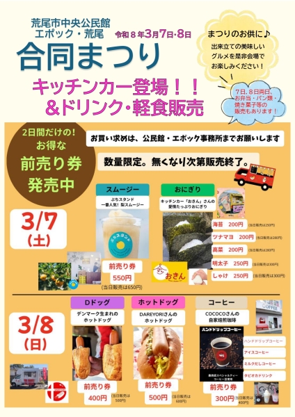 - 3月7日(土)、8日(日)に合同まつりを開催します☆ その際に飲食を販売しますが、現在前売りチケットを当日チケットよりもお安く販売しております!是非この機会にご購入頂ければと思います♫